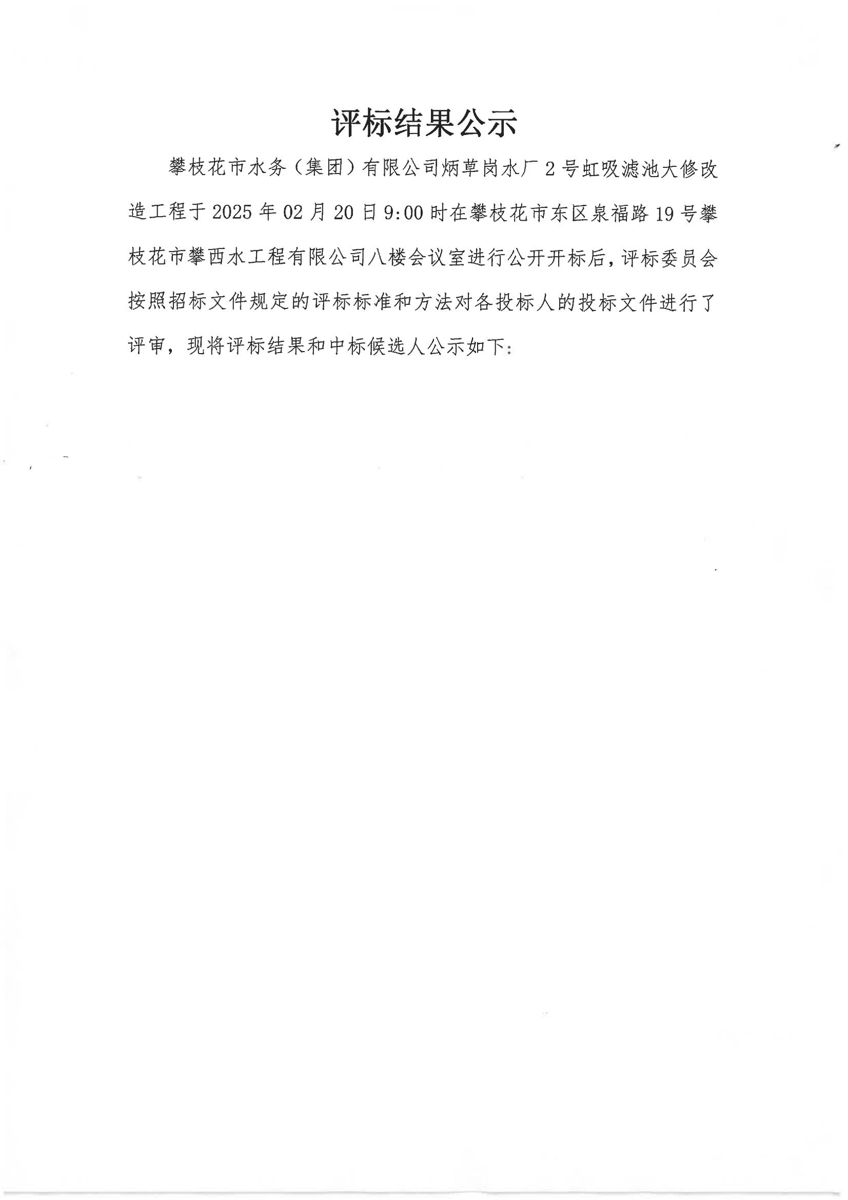 攀枝花市水務(wù)(集團)有限公司炳草崗水廠2號虹吸濾池大修改造工程中標候選人公示
