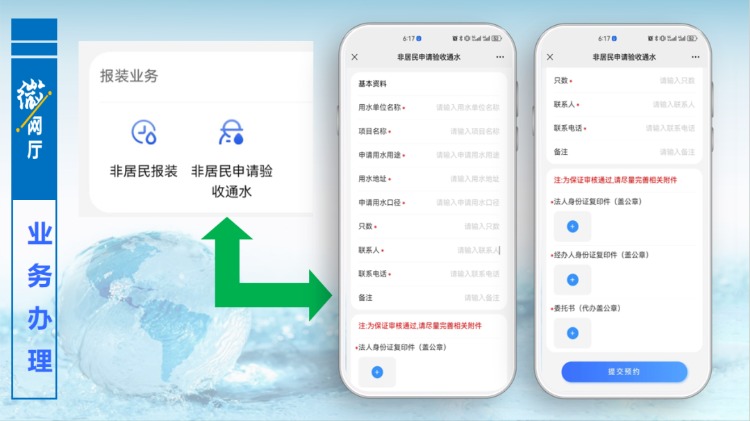 當(dāng)用水施工完成,達(dá)到通水條件,用戶(hù)同樣可在“微網(wǎng)廳”中,辦理驗(yàn)收通水申請(qǐng),填寫(xiě)相關(guān)信息,上傳附件,提交預(yù)約,后臺(tái)工作人員會(huì)主動(dòng)聯(lián)系用戶(hù),進(jìn)行驗(yàn)收通水。